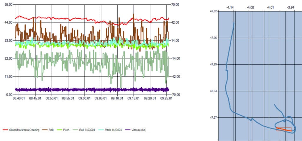 Rouge : Écartement – Vert : Roulis bâbord – Marron : Roulis tribord – Vert clair : tangage tribord – Bleu clair : Tangage bâbord – Violet : vitesse